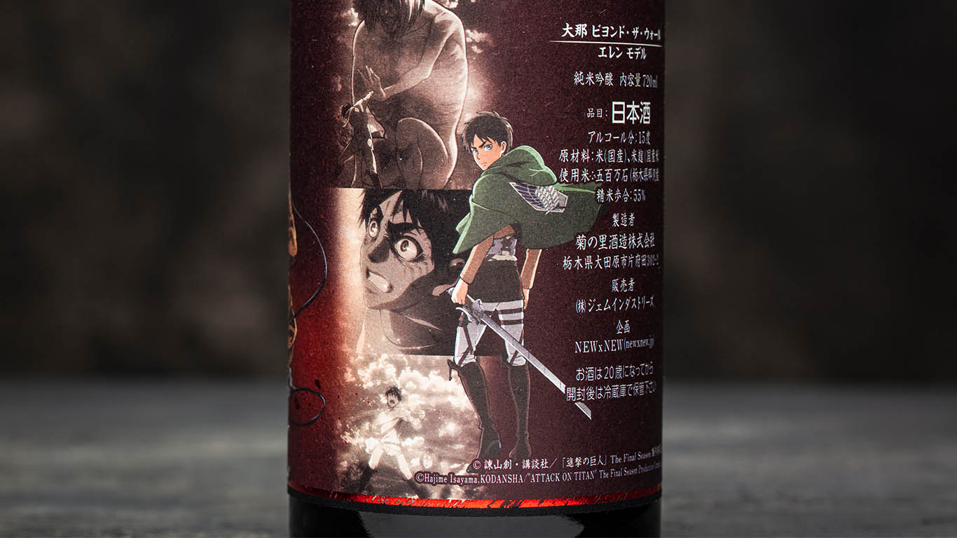 Este sake es un Junmai Ginjo, con un pulido del arroz hasta dejar el 55% de este. Elaborado con arroz de la variedad Gohyakumangoku, que produce un sake muy claro e increiblemente suave. Eren es el personaje principal de Beyond The Wall. Este sake es como el carácter de Eren, puro y directo. Bien equilibrado entre sabores dulces y secos, va muy bien con diferentes tipos de platos.